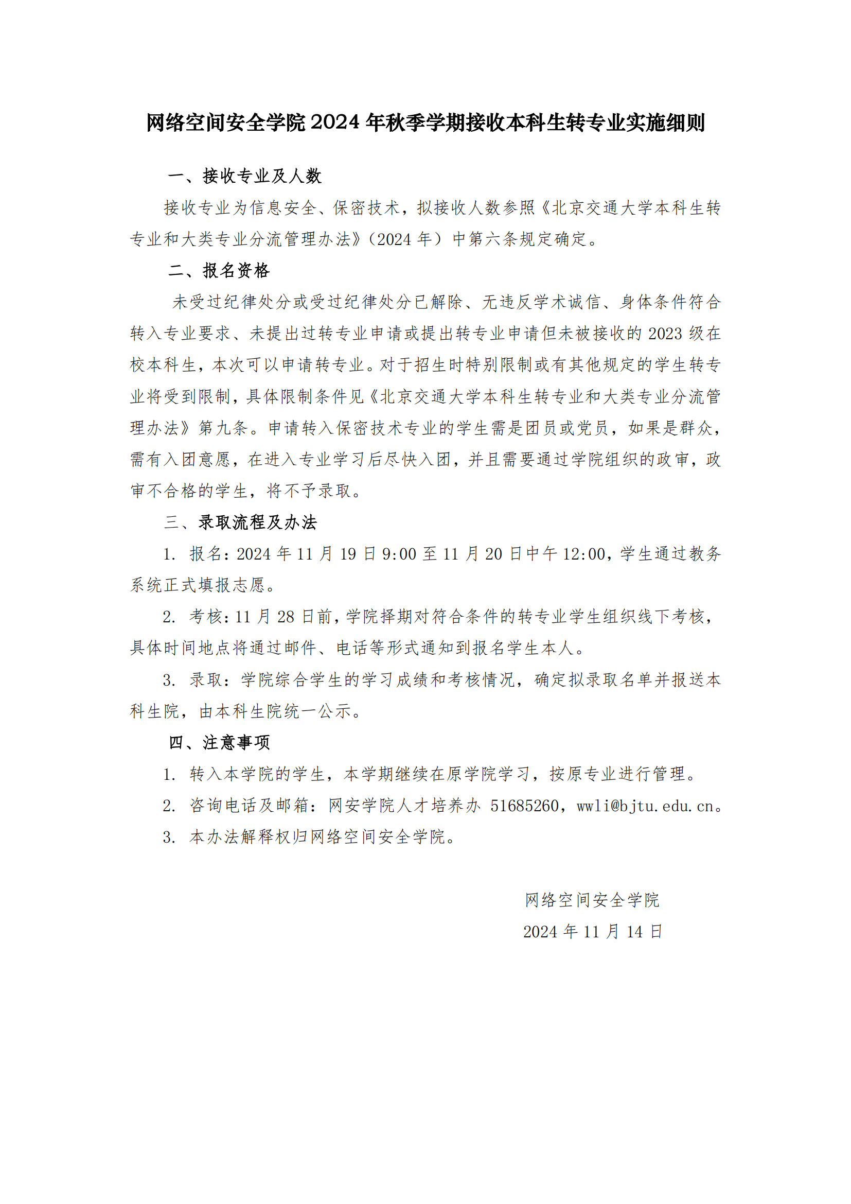 网络空间安全学院 2024 年秋季学期接收本科生转专业实施细则