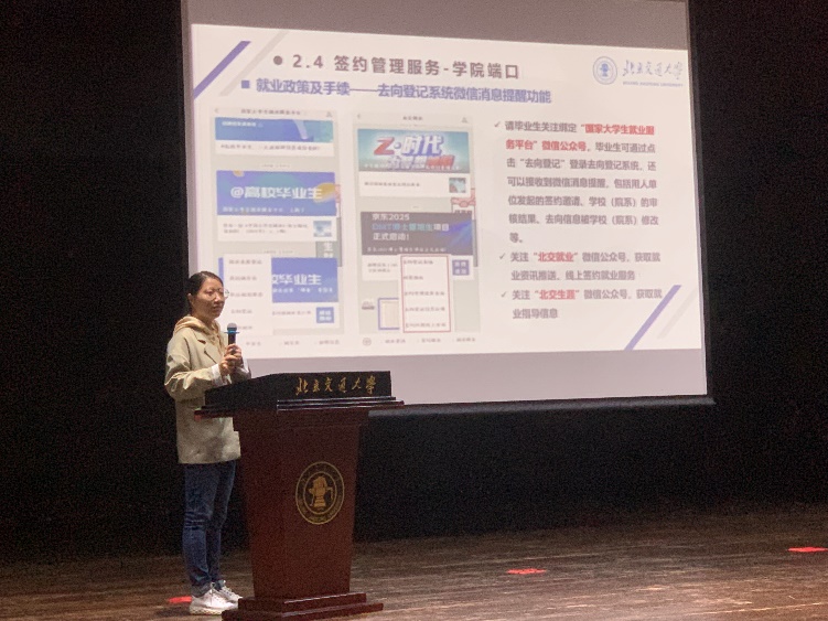温馨从学校整体就业情况、就业形势、就业政策、就业手续等方面进行了详细解读,对我校签约管理服务、就业平台和就业创业相关活动进行了详细讲解。梁妍娇以如何找到“好”工作为题,对学生求职岗位匹配、求职方向确定、简历制作要点及面试技巧提升等多个方面进行了系统讲解,在职业发展指导的基础上提高学生的求职竞争力。