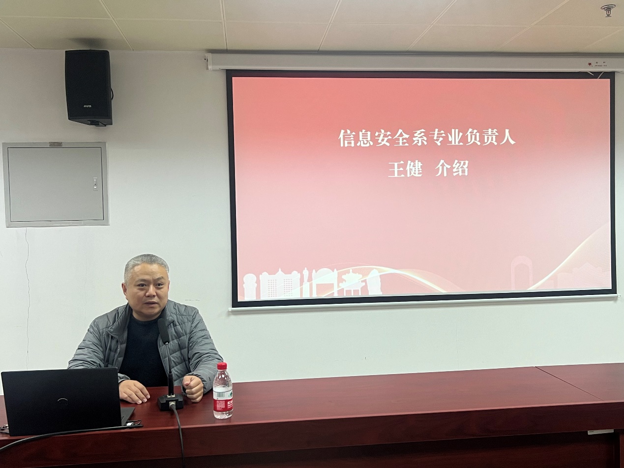 王健从信息安全专业历史沿革、专业课程设置情况、科研竞赛等方面对信息安全专业的基本情况进行了介绍。他指出,希望同学们能通过专业课程学习掌握计算机、信息安全、密码学基础知识,重视专业特色课程学习,把握小学期实践实习机会,在课程及实践中,提升专业能力,适应社会发展,成为国家所需的专业人才。