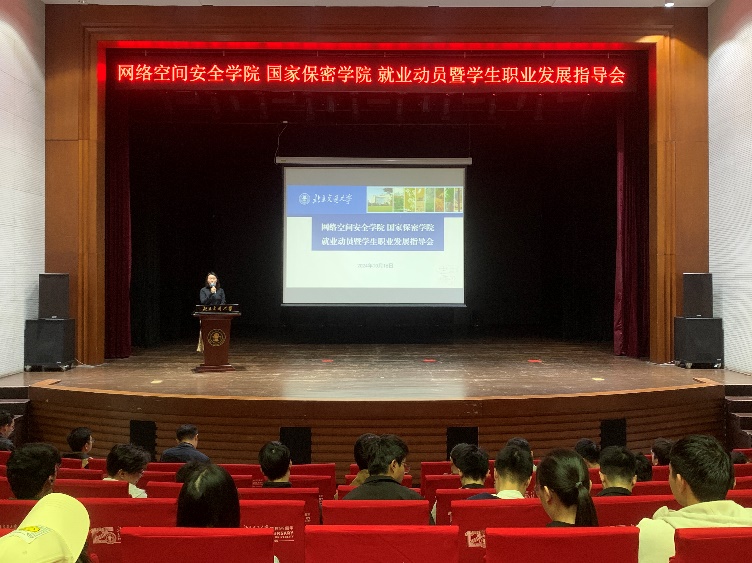 网络空间安全学院(国家保密学院)10月16日在学生活动服务中心小剧场召开2025届就业动员暨职业发展指导会。学院党委副书记、副院长安志强,学校就业与创业指导中心温馨老师、梁妍娇老师,学院学工办、团委负责老师和学院全体本科生、研究生毕业生参加会议。会议由学工办主任于海妹主持。