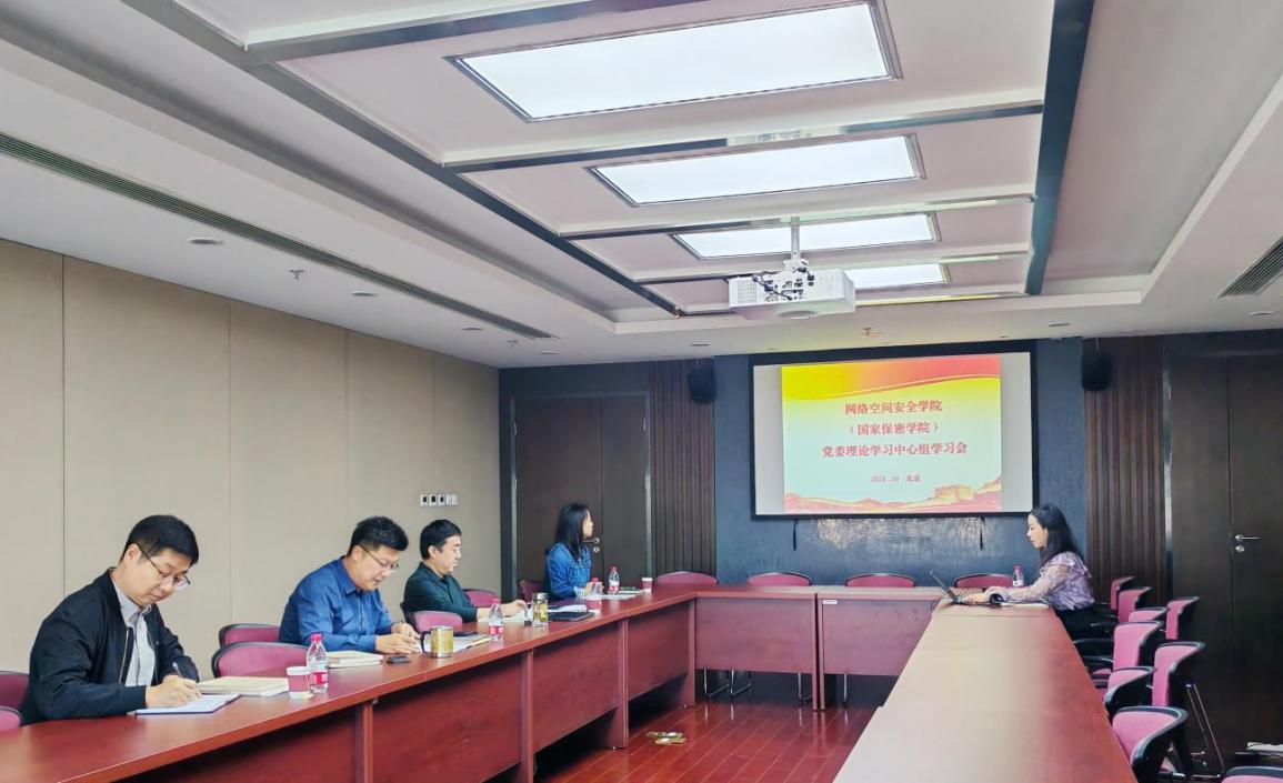 2024年10月11日,网络空间安全学院(国家保密学院)召开党委理论学习中心组会议,通过视频观摩、领读领学和交流研讨的方式,深入学习习近平同志《论教育》重点篇目,围绕中华人民共和国成立75周年开展专题学习,学院党委理论学习中心组全体成员参加学习,学院党委书记杜晔主持集体学习。
