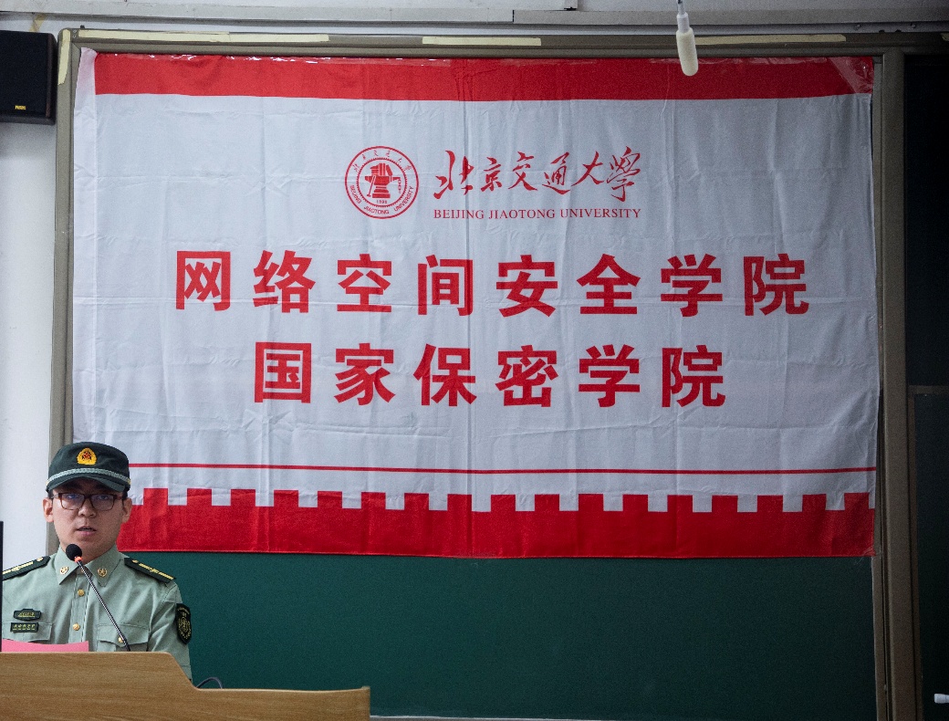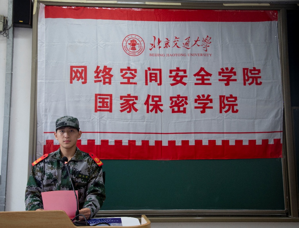 军训营员代表刘文博代表全体新生发言,表示将以饱满的热情和坚定的意志投入训练,服从指挥、锤炼自我,展现网安学子的精神风貌。