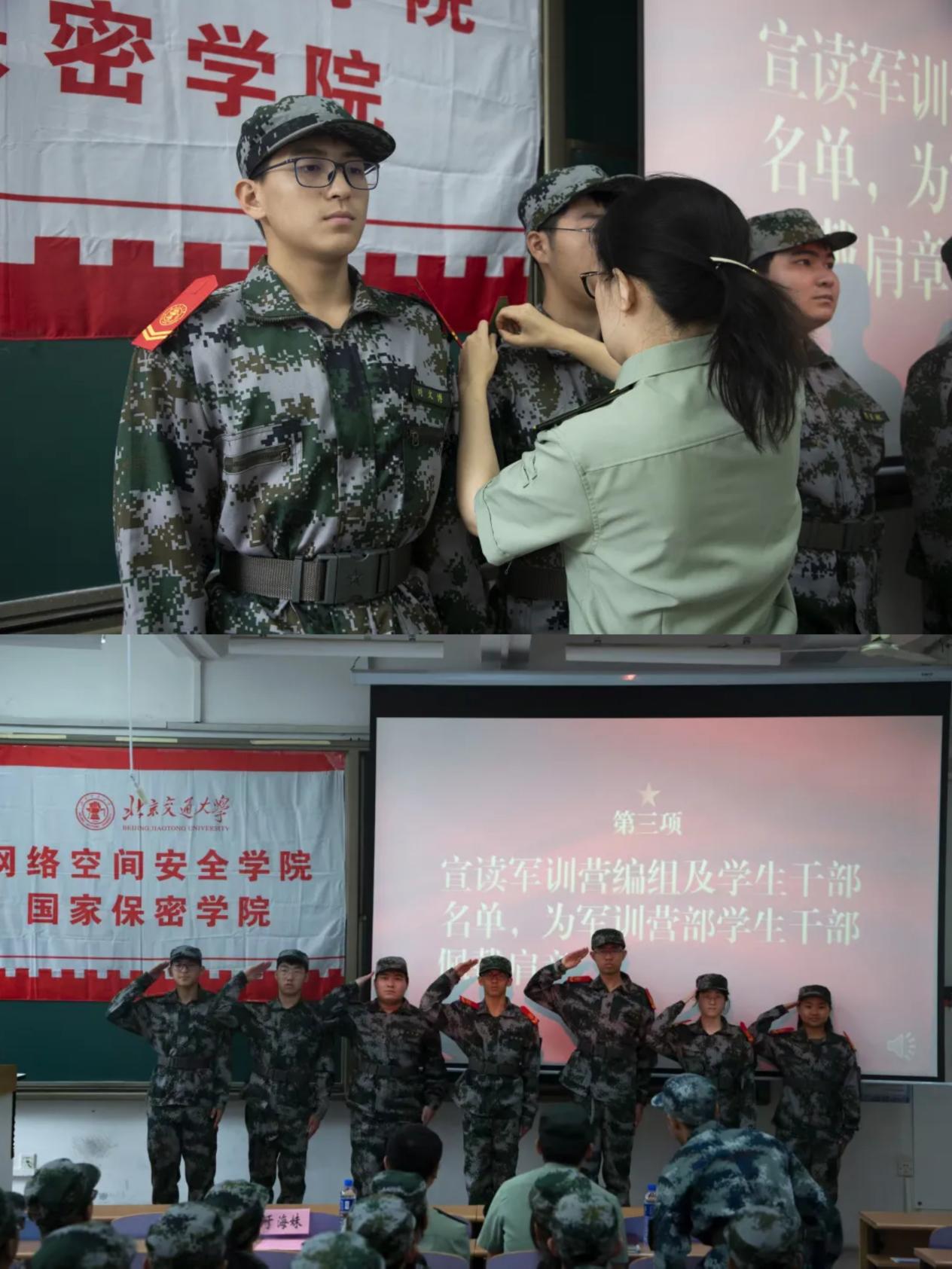教导员齐彤旭宣读军训营编组名单,宣读辅导员助理及营部学生干部任命。学工办主任于海妹、教导员齐彤旭、辅导员助理卢绍天学长为干部佩戴肩章,闪亮的肩章象征着荣誉与责任。