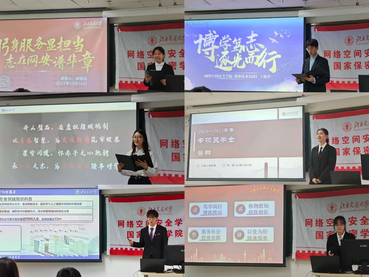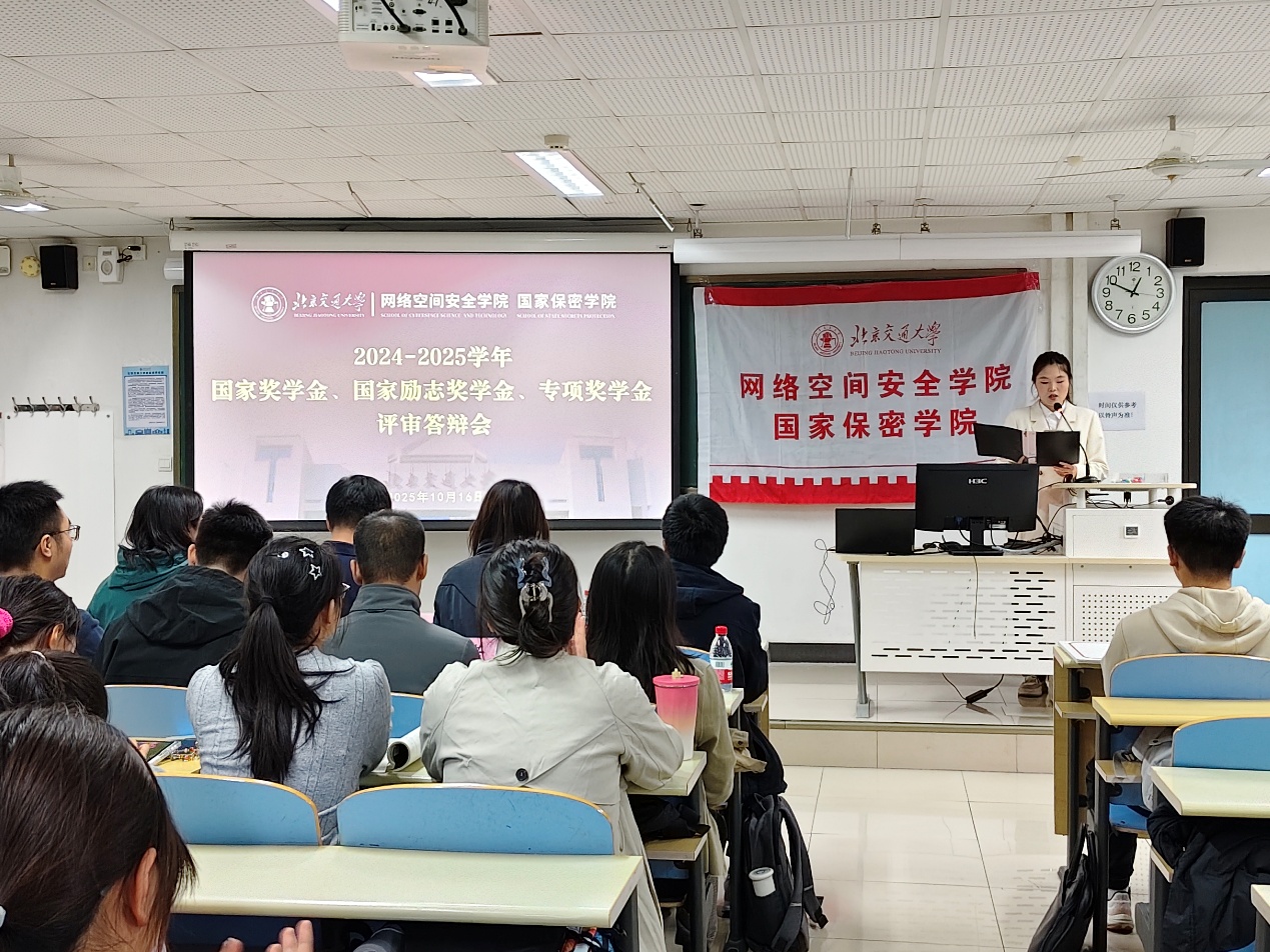 2025年10月16日中午,网络空间安全学院在逸夫楼415教室举办2024—2025学年国家奖学金、国家励志奖学金和专项奖学金评审答辩会。学院党委副书记、副院长安志强,副院长李静,教师代表、培养办主任、学工办主任、班主任代表、辅导员和学生代表担任评委,各年级本科生代表到场观摩。