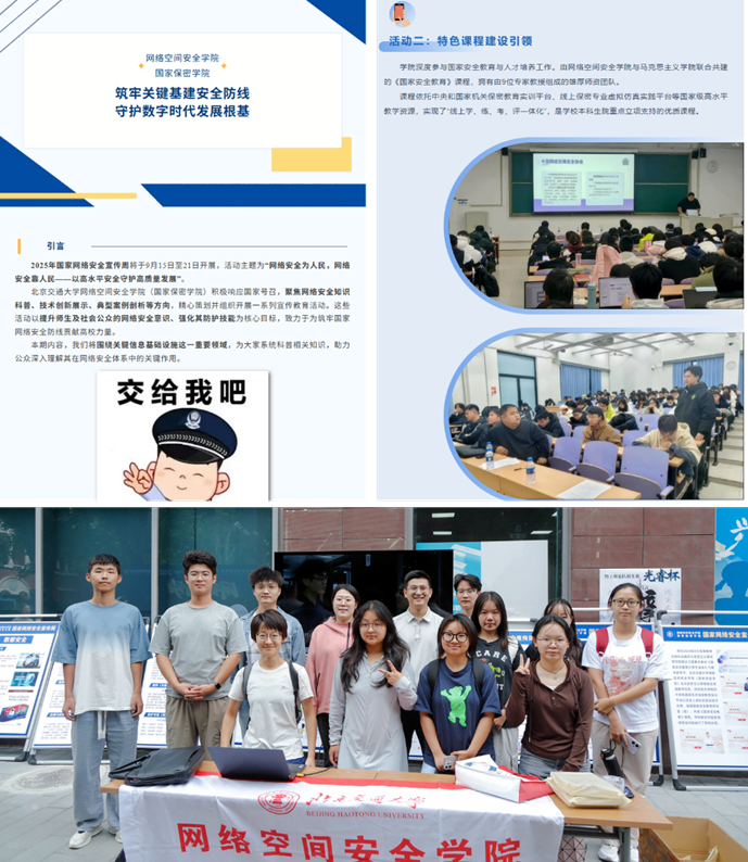 线上线下齐开展。学院制作了“国家网络安全宣传周”系列推送,通过网安学院微信公众号、企业号线上推送,让更多师生了解网络安全科普知识。学院在“校园日”线下开展为期两天的路演活动,帮助师生提高网络安全防范能力。