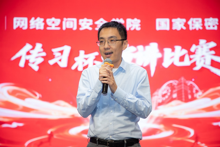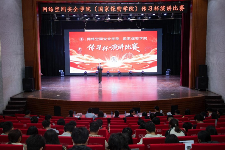 为深入学习贯彻习近平新时代中国特色社会主义思想,着力引导青年学生在“读原著、学原文、悟原理”中凝心铸魂,网络空间安全学院(国家保密学院)于10月17日在学生活动服务中心小剧场举办学院“传习杯”主题演讲比赛决赛。学院党委书记杜晔、校团委副书记安薇参加活动。学院党委副书记、副院长安志强,马克思主义学院副教授李营辉,学工办主任于海妹,团委书记杨帆和校学生微宣讲团副团长邢云同学担任评委。